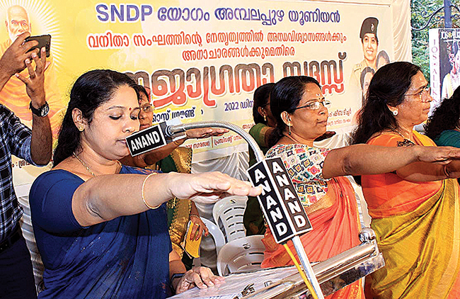ആലപ്പുഴ: അന്ധവിശ്വാസങ്ങൾക്കും അനാചാരങ്ങൾക്കുമെതിരെ എസ്.എൻ.ഡി.പി.യോഗം അമ്പലപ്പുഴ യൂണിയൻ വനിതാ സംഘത്തിന്റെ നേതൃത്വത്തിൽ ജനജാഗ്രത സദസ് നടത്തി.ബോട്ടുജെട്ടിക്കു സമീപമുള്ള ആലുക്കാസ് ഗ്രൗണ്ടിൽ പ്രസിഡന്റ് ഡോ: സേതുരവിയുടെ അദ്ധ്യക്ഷതയിൽ കൂടിയ സമ്മേളനം കേന്ദ്ര വനിതാ സംഘം വൈസ് പ്രസിഡന്റ് ഷീബ വേണുഗോപാലൻ ഉത്ഘാടനം ചെയ്തു. നഗരസഭ ചെയർപേഴ്‌സൺ സൗമ്യാരാജ് ജാഗ്രത പ്രതിജ്ഞാ വാചകം ചൊല്ലിക്കൊടുത്തു. യൂണിയൻ പ്രസിഡൻറ് പി.ഹരിദാസ്,സെക്രട്ടി കെ.എൻ.പ്രേമാനന്ദൻ, വനിതാ സംഘം ജോ. സെക്രട്ടറി ശോഭന അശോക് കുമാർഎന്നിവർ സന്നിഹിതരായിരുന്നു. വനിതാ സംഘം താലൂക്ക് സെക്രട്ടറി ജെമിനി സ്വാഗതവും വൈസ് പ്രസിഡന്റ് ഗീത രാംദാസ് നന്ദിയും പറഞ്ഞു.