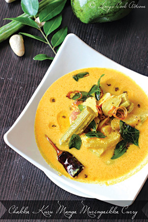 പച്ചച്ചക്കയുടെ മടല് (മുള്ളു ചെത്തിയത്) 1” സമചതുരക്കഷ്ണങ്ങള് ആയരിഞ്ഞത് – രണ്ട് കപ്പ്, മുരിങ്ങക്ക – ഒരെണ്ണം, ചക്കക്കുരു – 5-8 എണ്ണം, മഞ്ഞള്പ്പൊടി – മുക്കാല് ടീസ്പൂണ്, ചുരണ്ടിയ തേങ്ങ – ഒന്നേകാല് കപ്പ്+ഒരു ടേബിള്സ്പൂണ്, വെളുത്തുള്ളി – മൂന്ന് അല്ലി, മുളകുപൊടി – ഒരു ടീസ്പൂണ്, കുരുമുളക് – മൂന്നെണ്ണം, കറിവേപ്പില – രണ്ട് തണ്ട്, കടുക്, ഉഴുന്ന് – കാല് ടീസ്പൂണ്, എണ്ണ – 3 ടീസ്പൂണ്, ഉണക്കമുളക് – രണ്ടെണ്ണം.