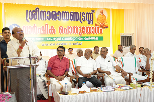 ചേര്ത്തല ശ്രീനാരായണ കോളേജ് ഓഡിറ്റോറിയത്തില് ചേര്ന്ന വാര്ഷിക പൊതുയോഗത്തില് ട്രസ്റ്റ് സെക്രട്ടറി വെള്ളാപ്പള്ളി നടേശന് റിപ്പോര്ട്ടും കണക്കും ബഡ്ജറ്റും അവതരിപ്പിച്ചു. ചെയര്മാന് ഡോ. എം.എന്. സോമന് അദ്ധ്യക്ഷനായി. ട്രഷറര് ഡോ. ജി. ജയദേവന്, അസി.സെക്രട്ടറി തുഷാര് വെള്ളാപ്പള്ളി എന്നിവര് സംസാരിച്ചു. ഓഡിറ്റര് അബ്ദുള്റഹിം, എക്സിക്യൂട്ടീവ് അംഗങ്ങളായ സന്തോഷ് അരയാക്കണ്ടി, എ.ആര്. ഗോപിനാഥ്, എ. സോമരാജന്, സി.ബി. രാജേന്ദ്രന്, മോഹന് ശങ്കര്, കെ. പത്മകുമാര് തുടങ്ങിയവര് പങ്കെടുത്തു.