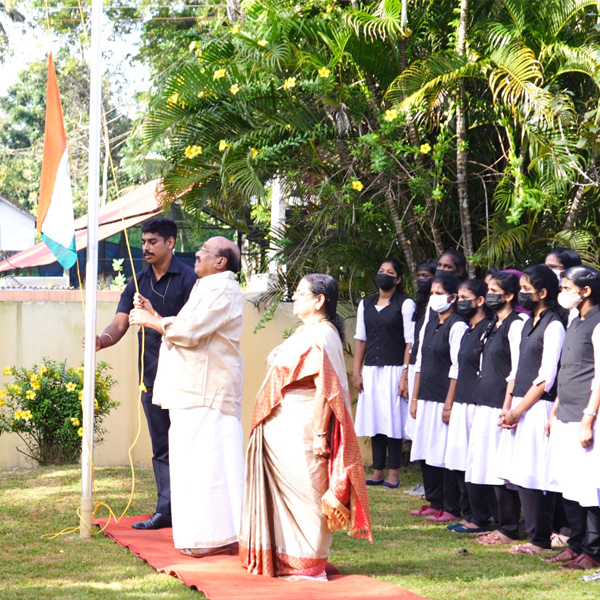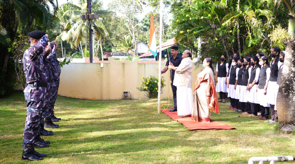 ( ആസാദി കാ അമൃത് മഹോത്സവം) ഭാഗമായി ധീരജവാന്മാരുടെയും വിദ്യാര്ത്ഥികളുടെയും സാന്നിദ്ധ്യത്തില് എസ്.എന്.ഡി.പി യോഗം ജനറല് സെക്രട്ടറി വെള്ളാപ്പള്ളി നടേശന് കണിച്ചുകുളങ്ങരയിലെ വസതിയില് ദേശിയ പതാക ഉയര്ത്തുന്നു.പത്നി പ്രീതി നടേശന് സമീപം