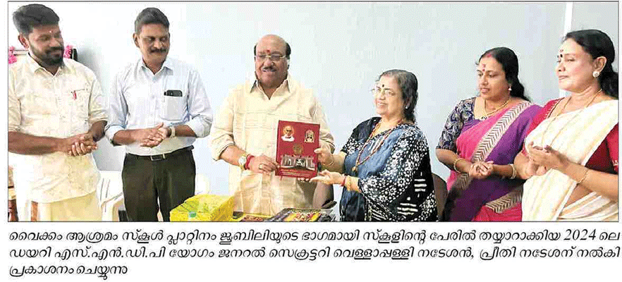 വൈക്കം: ആശ്രമം സ്‌കൂള്‍ പ്ലാറ്റിനം ജൂബിലി വര്‍ഷത്തില്‍ മികവിന്റെ ഒരദ്ധ്യായം കൂടി എഴുതിച്ചേര്‍ക്കുന്നു. സ്‌കൂളിന്റെ പേരില്‍ തയ്യാറാക്കിയ 2024 ലെ ഡയറി എസ്.എന്‍.ഡി.പി യോഗം ജനറല്‍ സെക്രട്ടറി വെള്ളാപ്പള്ളി നടേശന്‍ പ്രകാശനം ചെയ്തു.