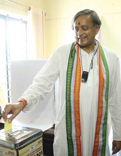 ഇന്ത്യന് നാഷണല് കോണ്ഗ്രസ്സിന്റെ പ്രസിഡന്റ് സ്ഥാനത്തേയ്ക്ക് മത്സരിക്കാന് ഉറച്ചപ്പോള് ഒരു കാര്യമേ തരൂര് ഉറപ്പിച്ചിരുന്നുള്ളൂ. അത് കോണ്ഗ്രസ്സില് തെരഞ്ഞെടുപ്പ് സംവിധാനത്തെ പ്രവര്ത്തനക്ഷമമാക്കലായിരുന്നു. അതില് അദ്ദേഹം വിജയിച്ചു. മാത്രമല്ല ഗാന്ധി കുടുംബത്തിന്റെ എല്ലാ സഹായവും ഉണ്ടായിരുന്ന മല്ലികാര്ജ്ജുന ഖാര്ഗെ 7897 വോട്ടു നേടിയപ്പോള് തരൂര് 1072 വോട്ട് നേടി. തരൂര് ആഗ്രഹിച്ചതു നേടി. അതുകൊണ്ടാണ് മാധ്യമങ്ങള് ”തോറ്റിട്ടും ജയിച്ച തരൂര്” എന്ന് വെണ്ടക്ക നിരത്തിയത്. കോണ്ഗ്രസ്സ് അദ്ധ്യക്ഷ സ്ഥാനത്തേയ്ക്ക് ഗാന്ധി കുടുംബത്തിന് അനഭിമതരായ നേതാക്കള് മത്സരിച്ച സമയത്ത് അവര് പ്രഗത്ഭരായിരുന്നെങ്കിലും കാര്യമായി വോട്ട് നേടാന് കഴിഞ്ഞിരുന്നില്ല എന്നതാണ് ചരിത്രം. 1977 ല് ബ്രഹ്മാനന്ദ റെഡ്ഡിക്കെതിരെ മത്സരിച്ച പശ്ചിമബംഗാള് മുഖ്യമന്ത്രിയും കേന്ദ്ര ആഭ്യന്തര മന്ത്രിയുമായിരുന്ന സിദ്ധാര്ത്ഥ ശങ്കര് റായിക്ക് 160 വോട്ടു മാത്രമാണ് കിട്ടിയത്. 1999 ല് സീതാറാം കേസരിക്കെതിരെ മത്സരിച്ച ശക്തനായ ശരദ് പവാറിന് 882 വോട്ട് കിട്ടി. എന്നാല് 2000ത്തില് സോണിയഗാന്ധിക്കെതിരെ മത്സരിച്ച ജിതേന്ദ്രപ്രസാദയ്ക്ക് കിട്ടിയത് കേവലം 94 വോട്ടായിരുന്നു. കോണ്ഗ്രസ്സില് ഗാന്ധി കുടുംബത്തിന്റെ ശക്തി എത്ര പ്രബലമാണ് എന്നത് മനസ്സിലാക്കാന് ഈ കണക്ക് മതി.