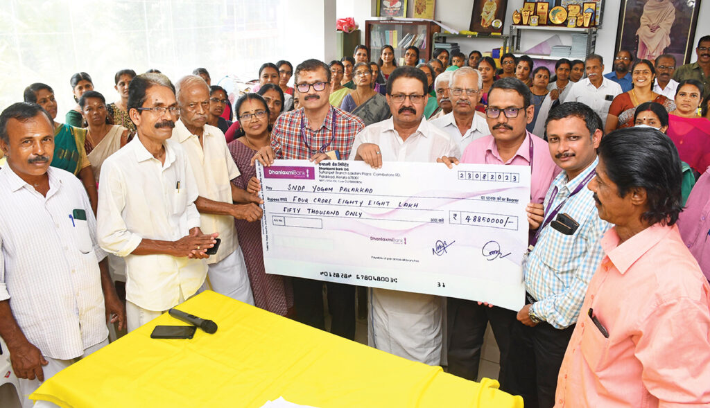 എസ്.എന്‍.ഡി.പി യോഗം പാലക്കാട് യൂണിയന്റെ പരിധിയില്‍ പ്രവര്‍ത്തിക്കുന്ന 35 വനിതാസ്വയം സഹായ സംഘങ്ങള്‍ക്ക് ധനലക്ഷ്മി ബാങ്ക് ക്ലസ്റ്റര്‍ ഹെഡ് എന്‍. ഹരീഷ് ചെക്ക് കൈമാറിയപ്പോൾ.