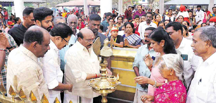 കണിച്ചുകുളങ്ങര ക്ഷേത്രത്തില്‍ കെ.എല്‍. അശോകന്‍ സമര്‍പ്പിക്കുന്ന 11-ാം ഉത്സവത്തിന്റെ ദീപപ്രകാശനം ദേവസ്വം പ്രസിഡന്റ് വെള്ളാപ്പള്ളി നടേശന്‍ നിര്‍വഹിക്കുന്നു. കെ.എല്‍. അശോകന്‍, സുവിത അശോകന്‍, അക്ഷയ് അശോക്, എസ്.എന്‍.ഡി.പി യോഗം വൈക്കം യൂണിയന്‍ പ്രസിഡന്റ് പി.വി. ബിനേഷ്, ദേവസ്വം സെക്രട്ടറി പി.കെ. ധനേശന്‍, സ്‌കൂള്‍ മാനേജിംഗ് കമ്മറ്റി അംഗം പി. പ്രകാശന്‍ എന്നിവര്‍ സമീപം.