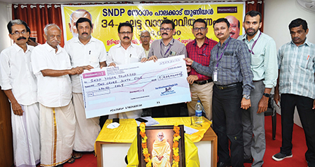 പാലക്കാട് യൂണിയന്റെ വനിതാ സ്വയം സഹായ സംഘങ്ങൾക്ക് ധനലക്ഷ്മി ബാങ്ക് പാലക്കാട് സുൽത്താൻപേട്ട ബ്രാഞ്ച് മുഖേന നൽകുന്ന 2.65കോടി വായ്പാ വിതരണത്തിന്റെ ആദ്യചെക്ക് ബാങ്ക് ക്ളസ്റ്റർ ഹെഡ് എൻ.സതീഷ് കൈമാറുന്നു.യോഗം യൂണിയൻ സെക്രട്ടറി കെ.ആർ ഗോപിനാഥ് ഉദ്ഘാടനം ചെയ്തു.പ്രസിഡന്റ് ആർ ഭാസ്കരൻ അദ്ധ്യക്ഷനായിരുന്നു.