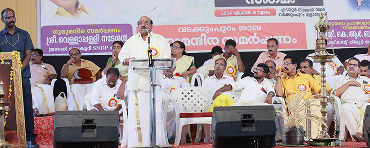 മലപ്പുറം യൂണിയന് എടയൂര് പഞ്ചായത്തിലെ വടക്കുംപുറത്ത് സംഘടിപ്പിച്ച ശ്രീനാരായണ സംഗമത്തോട് അനുബന്ധിച്ചുള്ള പൊതു സമ്മേളനം ഉദ്ഘാടനം ചെയ്ത് സംസാരിക്കുകയായിരുന്നു അദ്ദേഹം. മലപ്പുറം യൂണിയന് പ്രസിഡന്റ് ദാസന് കോട്ടക്കല് അദ്ധ്യക്ഷത വഹിച്ചു. യൂണിയന് സെക്രട്ടറി സുബ്രഹ്മണ്യന് ചുങ്കപ്പള്ളി സ്വാഗതം പറഞ്ഞു. തിരൂര് യൂണിയന് പ്രസിഡന്റ് കെ ആര് ബാലന്, യോഗം ഡയറക്ടര്മാരായ പ്രദീപ് കുമാര് ചുങ്കപ്പള്ളി, നാരായണന് നല്ലാട്ട്, ഹരിദാസന് പി കെ, സുനില് പട്ടാണത്ത്, ഗീത ടിച്ചര് വില്ലോടി, വത്സല പി കെ, ജിതിന്ദ്രന് മണ്ണില്തൊടി തുടങ്ങിയവര് സംസാരിച്ചു. വടക്കുംപുറം ശാഖായോഗത്തിന് വേണ്ടി നിര്മ്മിച്ച ഗുരുദേവ മന്ദിരം വെള്ളാപ്പള്ളി നടേശന് ഉദ്ഘാടനം ചെയ്തു. ഗുരുദേവ മന്ദിരത്തിലെ പ്രാര്ത്ഥനാ ഹാള് തിരൂര് യൂണിയന് പ്രസിഡന്റ് കെ ആര് ബാലന് ഉദ്ഘാടനം ചെയ്തു. ശാഖാ യോഗം പ്രസിഡന്റ് ബാലകൃഷ്ണന് മച്ചിങ്ങല് പതാക ഉയര്ത്തി. ഇരിങ്ങാലക്കുട ശ്രീനാരായണാശ്രമത്തിലെ സ്വാമി ബ്രഹ്മ സ്വരൂപാനന്ദ അനുഗ്രഹ പ്രഭാഷണം നടത്തി. യോഗം അസി. സെക്രട്ടറി അഡ്വ. രാജന് മഞ്ചേരി മുഖ്യ പ്രഭാഷണം നടത്തി. ശാഖാ പ്രസിഡന്റ് കൃഷ്ണന് കാവുംപുറം അധ്യക്ഷത വഹിച്ചു. സെക്രട്ടറി മണി മച്ചിങ്ങല്, രാമദാസന് തണ്ടാന്പറമ്പില്, മോഹനന്. കെ തുടങ്ങിയവര് സംസാരിച്ചു.