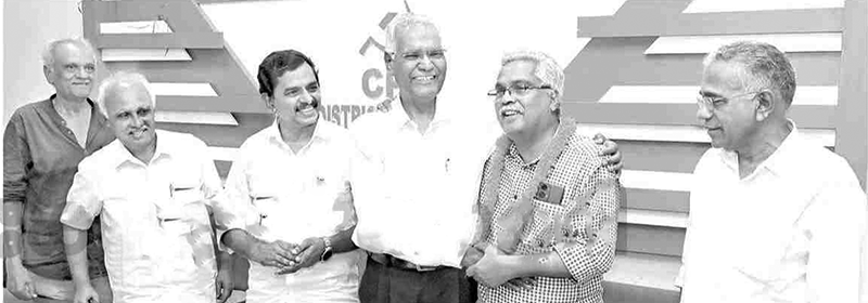 കോട്ടയം സി.പി.ഐ. ജില്ലാ കൗണ്‍സില്‍ ഓഫീസില്‍ ചേര്‍ന്ന സിപിഐ സംസ്ഥാന എക്‌സിക്യൂട്ടീവ് യോഗത്തില്‍ ദേശീയ സെക്രട്ടറി ഡി. രാജ, സംസ്ഥാന സെക്രട്ടറിയായി ചുമതല ഏറ്റെടുത്ത ബിനോയ്‌വിശ്വത്തെ അഭിനന്ദിക്കുന്നു.