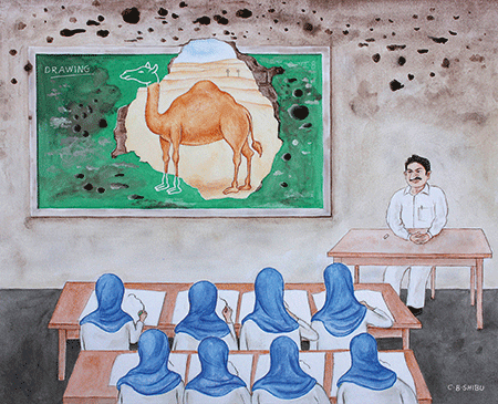 നിറയെ പ്രശ്നങ്ങൾ കരുതിവെച്ചിട്ടുള്ള മൗനമാണ് ചിത്രഭാഷ . ദൃശ്യഭാവുകത്വങ്ങളെ ജനങ്ങളുമായി കൂട്ടിമുട്ടിക്കുന്ന ഈ കാഴ്ചയുടെ രാഷ്ട്രീയത്തെ ഓരോ ചിത്രകാരനും ഓരോ വിധത്തിലാണ് സമീപിക്കുന്നത്. പൊതുമണ്ഡലത്തിന്റെ പാഠപരതയിലേക്ക് എളുപ്പത്തിൽ കടക്കാൻ പരിസ്ഥിതി ആഖ്യാനങ്ങൾക്കാവും. അത് ഒരു കലാകാരൻ മന:പൂർവ്വം അവലംബിക്കുന്ന നോട്ടത്തിന്റെ വക്രീകരണമാണ്. കാഴ്ചയുടെ ഇന്ദ്രിയാവേഗങ്ങളെ ഇത്തരത്തിൽ സ്ഥലപ്പെടുത്തുന്ന നിരവധി ചിത്രങ്ങൾ ഷിബു ചെയ്തിട്ടുണ്ട്. പ്രകൃതിയെ ഒരു വൈകാരിക ശരീരമാക്കിയാണ് ചിത്രീകരിക്കുന്നത്. പരിസ്ഥിതിയുടെ യഥാർത്ഥ ഫിഗറേറ്റീവ് രുചിയെ പകർത്തി കാട്ടുന്ന അത്തരം ചില ചിത്രങ്ങളെ ഉദ്ധരിക്കാം. ‘അസ്തമയം കാണുന്ന കുട്ടികൾ ‘ എന്ന ചിത്രം ചെമന്ന സൂര്യനെ മാത്രമല്ല ചിത്രീകരിക്കുന്നത് മറിച്ച് ചെമന്ന കടലിനെയും കാഴ്ചയിൽ പതിപ്പിച്ചെടുക്കുന്നുണ്ട്. മനുഷ്യൻ അശുദ്ധമാക്കിയ ജലസഞ്ചയത്തെയും അതുമൂലം വംശനാശം നേരിട്ട ജലജീവികളുടെ രക്തചൊരിച്ചിലിന്റെയും ചെമപ്പായും ഇതിനെ വായിച്ചെടുക്കാം. വിണ്ട പാടത്തിലൂടെ ജലപാനത്തിനുള്ള ഉറിയും തൂക്കി നടന്നുപോകുന്ന രണ്ടു മനുഷ്യരുടെ ഒരു ചിത്രമുണ്ട്. വരൾച്ചയുടെ തീവ്രതയെയും ക്രമം തെറ്റിയ പ്രകൃതിയുടെ മുറിവുകളെയും ഈ ചിത്രം തൊട്ടുകാണിക്കുന്നുണ്ട്. കടലിൽ നിന്നും കരയിലെത്തി ആകാശത്തിലേക്ക് ചെകിള വിരിക്കുന്ന മൂന്നു കടൽമത്സ്യങ്ങളുടെ ഒരു ചിത്രവുമുണ്ട്. കടൽക്കൊള്ളയുടെ കാലത്തിലെ മീനുകളുടെ അസ്വാതന്ത്ര്യത്തെയാണ് ഈ ചിത്രം രേഖീകരിക്കാൻ ശ്രമിക്കുന്നത്. നിർമ്മിത മഴയുടെ കാലത്തിലെ പരിസ്ഥിതിയെ പരിഹാസത്തോടെ ആവിഷ്കരിക്കുന്ന ഒരു ചിത്രമാണ് കമിഴ്ത്തിയ ഗ്ലാസിനുള്ളിൽ കുട ചൂടി നിൽക്കുന്ന ഇമോജി. കാണിയുടെ മനസ്സിലെ സമകാലിക പ്രകൃതിയെയും അതിന്റെ ശൂന്യസ്ഥലത്തെയും ഉചിതമായി നികത്തുന്ന ഒരു രീതിയാണ് ഷിബു ഇവിടെയൊക്കെ പരീക്ഷിക്കുന്നത്. കാണിയുടെ കണ്ണിനെ മുഷിപ്പിൽ നിന്നും വിടുവിക്കുന്ന അത്തരം ചില പ്രതീകങ്ങളും ബിംബങ്ങളും ഷിബുവിനെ ബാധിച്ച ആധിയാണ്.