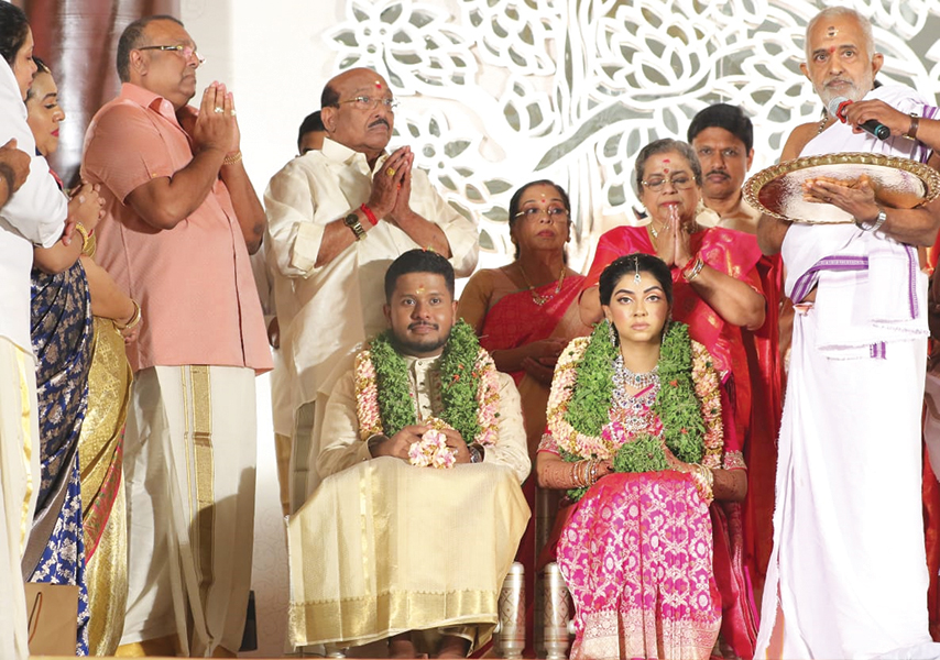 കൊച്ചി: എസ്.എന്.ഡി.പി യോഗം ജനറല് സെക്രട്ടറി വെള്ളാപ്പള്ളി നടേശന്റെയും പ്രീതിനടേശന്റെയും പൗത്രിയും, യോഗം വൈസ്പ്രസിഡന്റും ബി.ഡി.ജെ.എസ്. അദ്ധ്യക്ഷനും എന്.ഡി.എ. സംസ്ഥാന കണ്വീനറുമായ തുഷാര്വെള്ളാപ്പള്ളിയുടെയും ആശാ തുഷാറിന്റെയും മകളുമായ ദേവികയും, കൊല്ല മുഖത്തല കണ്ണന്സില് ഭരതന് സുരേഷ്ബാബുവിന്റെയും കെ.എസ്. ഗീതയുടെയും മകന് ഡോ. അനൂപും എറണാകുളം ബോള്ഗാട്ടി ഗ്രാന്റ് ഹയാത്ത് ഹോട്ടലില് വിവാഹിതരായി.