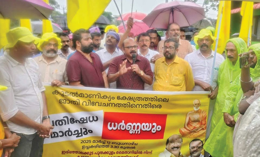 ഇരിങ്ങാലക്കുട: കൂടല്മാണിക്യം ക്ഷേത്രത്തിലെ ജാതിവിവേചനത്തിനെതിരെ എസ്.എന്.ഡി.പി യോഗം യൂത്ത്മൂവ്മെന്റ് ജില്ലാ കമ്മിറ്റിയുടെ നേതൃത്വത്തില് ക്ഷേത്രത്തിലേക്ക് നടത്തിയ പ്രതിഷേധ മാര്ച്ചും ധര്ണയുംയോഗം കൗണ്സിലര് ബേബിറാം ഉദ്ഘാടനം ചെയ്തു. യൂത്ത്മൂവ്മെന്റ് സംസ്ഥാന വൈസ്പ്രസിഡന്റ് എന്.വി. രഞ്ജിത്ത് അദ്ധ്യക്ഷത വഹിച്ചു. സജീഷ് കോട്ടയം മുഖ്യപ്രഭാഷണം നടത്തി. സംസ്ഥാന വൈസ്പ്രസിഡന്റ് രജീഷ് മരിക്കല്, യൂത്ത്മൂവ്മെന്റ് സംസ്ഥാന ജോയിന്റ് സെക്രട്ടറി ദിനില് മാധവന്, ജോയിന്റ് സെക്രട്ടറി ചിന്തുചന്ദ്രന്, ജില്ലാ പ്രസിഡന്റ് അനൂപ് കെ.ദിനേശന് തുടങ്ങിയവര് പ്രസംഗിച്ചു. വിവിധ യൂണിയന് ഭാരവാഹികളായ കെ.എ. ഉണ്ണിക്കൃഷ്ണന്, ടി.കെ. രവീന്ദ്രന്, സി.ഡി. ശ്രീലാല്, ബ്രുഗുണന് മനയ്ക്കലാത്ത്, കെ.എസ്. സുബിന്, യോഗം ഡയറക്ടര് കെ.കെ. ബിനു, യൂത്ത്മൂവ്മെന്റ് യൂണിയന് നേതാക്കന്മാരായ അഡ്വ. ജിനേഷ്, സുശീല് കുമാര്, ഇ.പി. പ്രശാന്ത്, കെ.എസ്. വിനൂപ്, സമല്രാജ്, കെ. എസ്. ശിവറാം, ശ്രീരാജ്, നിഖില് വൈക്കത്താടന്, ശരത് പെരുമറത്ത്, ദീപക് കുഞ്ഞുണ്ണി, സൈബര് ജില്ലാ കണ്വീനര് അഭിലാഷ് നെല്ലായി എന്നിവര് നേതൃത്വം നല്കി. നേരത്തെ പൂതക്കുളം മൈതാനിയില് നിന്നാരംഭിച്ച പ്രതിഷേധ മാര്ച്ച് യോഗം കൗണ്സിലര് പി.കെ. പ്രസന്നന് ഉദ്ഘാടനം ചെയ്തു. കുട്ടംകുളത്തിന് സമീപം മാര്ച്ച് പൊലീസ് തടഞ്ഞു.